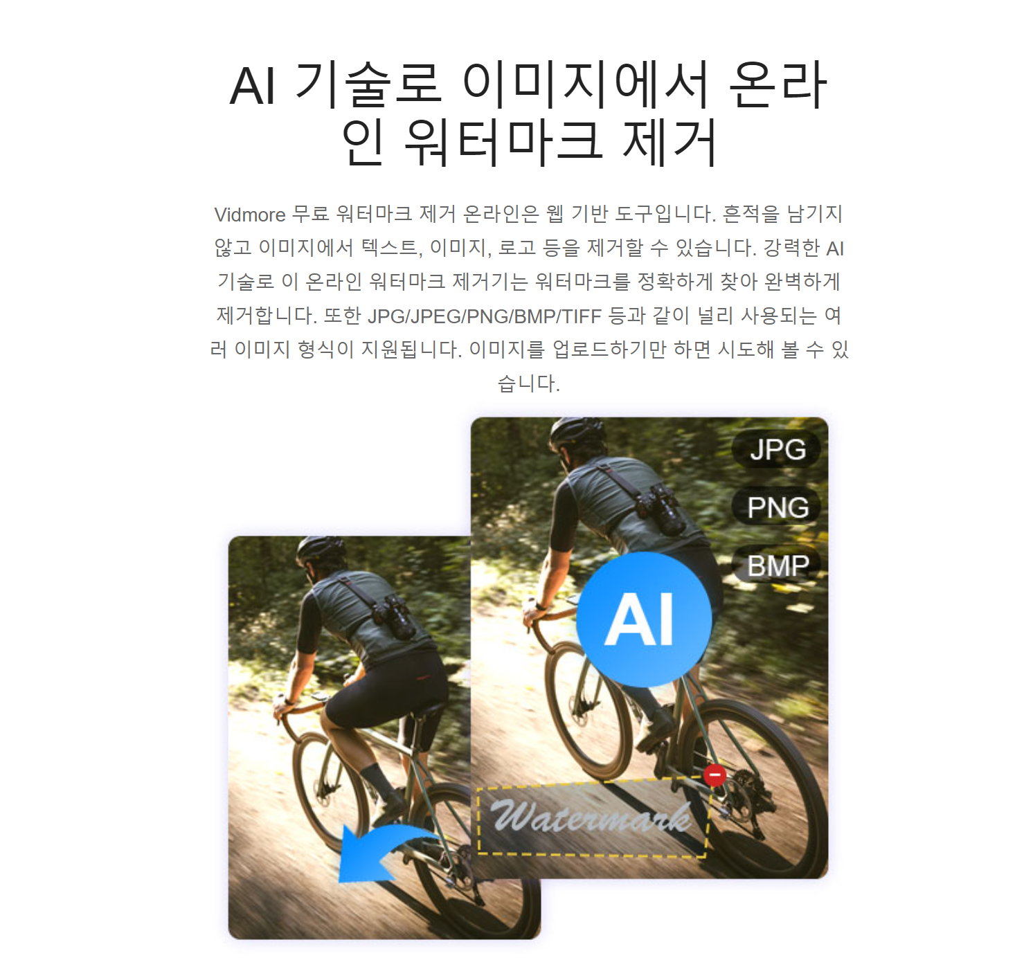 Vidmore은 AI 기술로 이미지에서 텍스트, 이미지, 로고, 워터마크 등을 제거하기에 다른 사이트에 비해 그 정확도가 높은 편에 속한다고 생각합니다. Jpg, Jpeg, png, bmp, tiff 등의 여러 이미지형식을 지원하고 사이트에서 단순히 이미지 파일을 업로드하면 별도의 가입 없이도 제거할 수 있다는 이점이 있습니다.