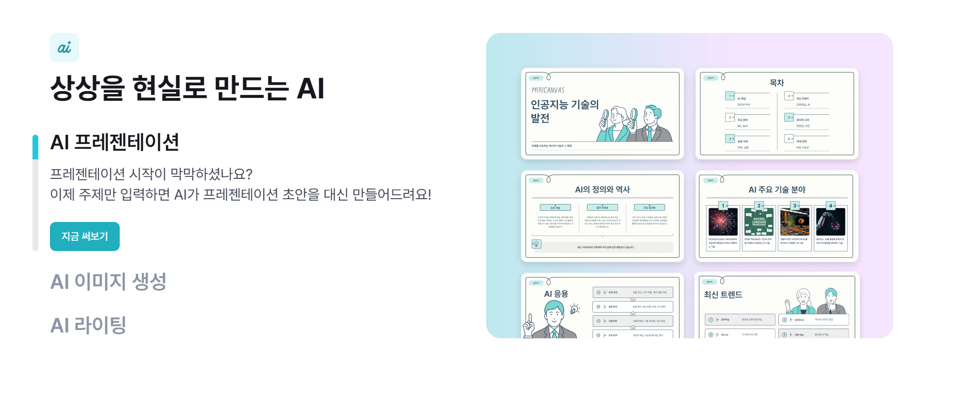 - 미리캔버스 접속 → 'AI 프레젠테이션 지금 써보기' 클릭
