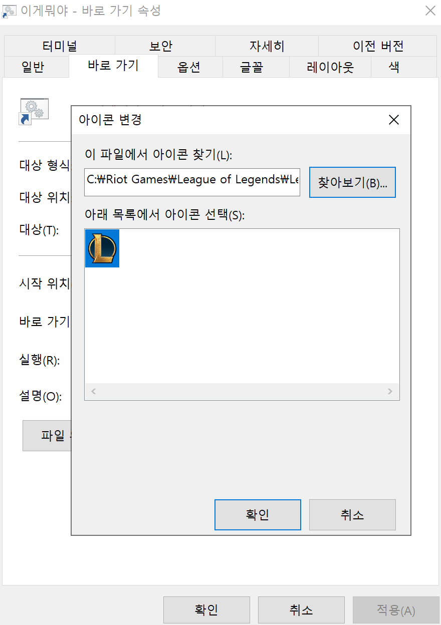 [속성] - [바로가기] - [아이콘 변경]을 이용하여